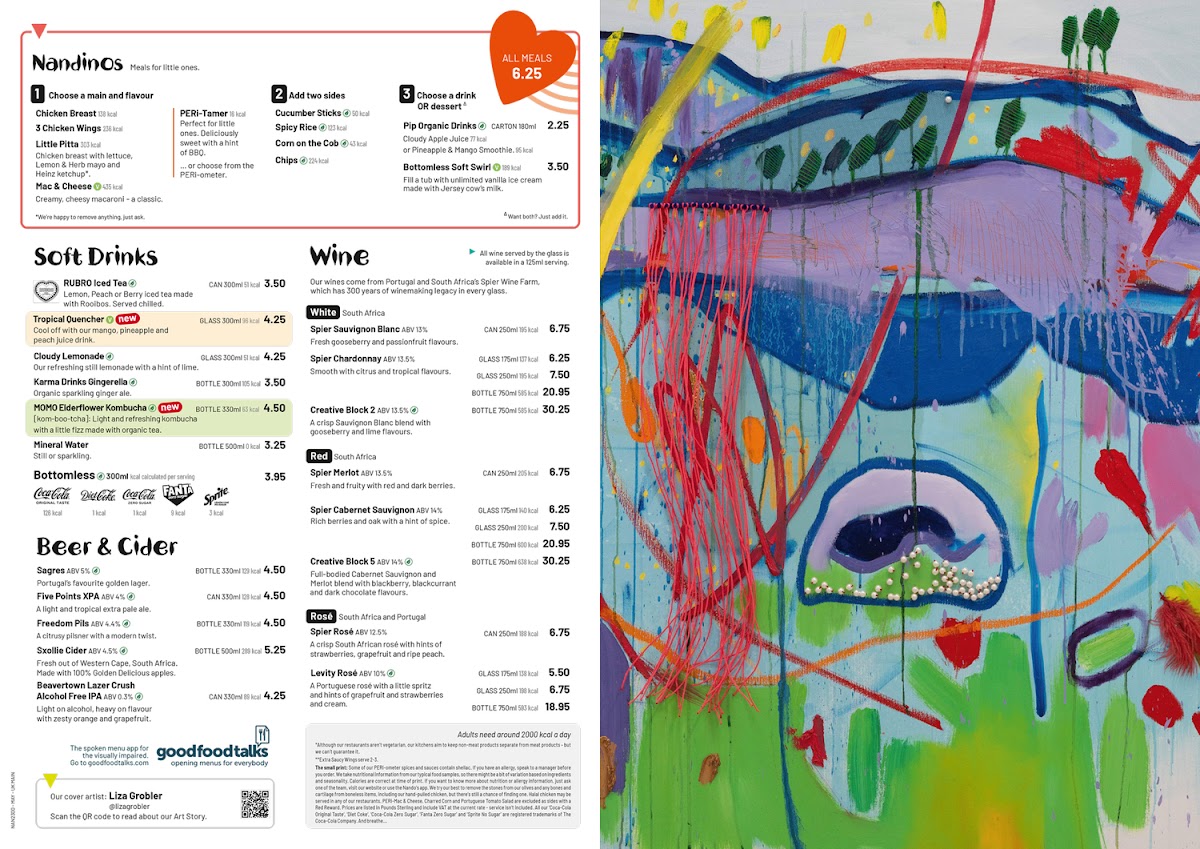 The Nando's Stoke - Etruria Mills Menu boasts the full range of classic offerings, including succulent flame-grilled chicken in your choice of spice level - from mild Lemon & Herb to fiery Extra Hot. The Butterfly Chicken, paired with creamy garlic bread and macho peas, is a personal favorite. For those craving a lighter bite, the Chicken Wrap or Supergrain Salad with a medium spice chicken fillet delivers on both flavor and satisfaction.